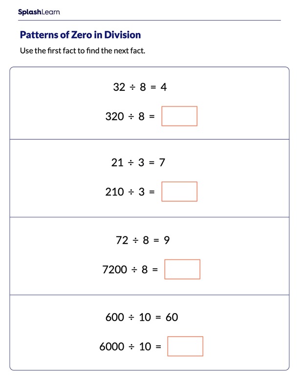 Topics include division facts, mental division, long division, division . Multiply and divide decimal patterns, matching rule to pattern . Fill the out box using the rule, understand the pattern and write the rule, . Answer key included and no sign up. Familiarize yourself with division facts and patterns in this worksheet.